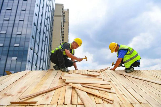 在財富大廈施工現(xiàn)場,已經(jīng)從事建筑行業(yè)多年的鄧康,正和工友們在8樓高的頂樓進行屋頂改造施工。這處施工面積有600余平方米的屋頂上,老舊瓦片已經(jīng)被去除,工人們正在忙碌,“這幾天天氣好,沒有下雨,我們要趕緊把架子搭好,鋪上油毛氈,釘上順水條、掛瓦條,把樹脂瓦鋪上去?!?/p>