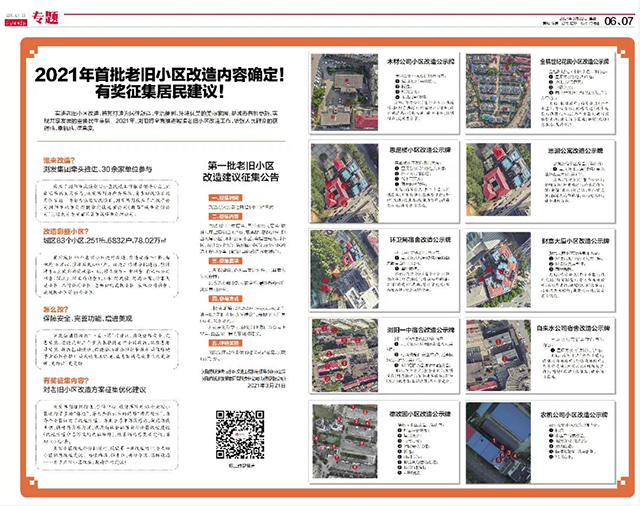 為了讓老舊小區(qū)改造更貼近民意,2021年3月起,瀏發(fā)集團通過新聞媒體分批次公布城區(qū)83個老舊小區(qū)改造內(nèi)容,并就老舊小區(qū)改造方案發(fā)布有獎意見征集公告,讓居民廣泛知曉、積極提建議,成為城市改造的參與者。