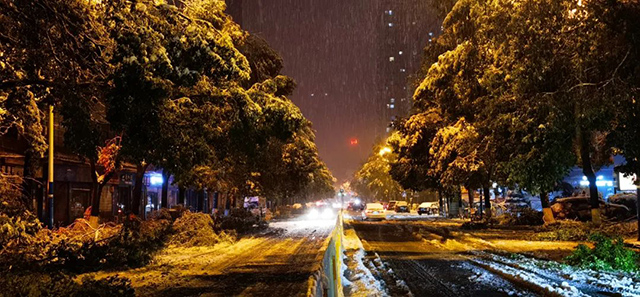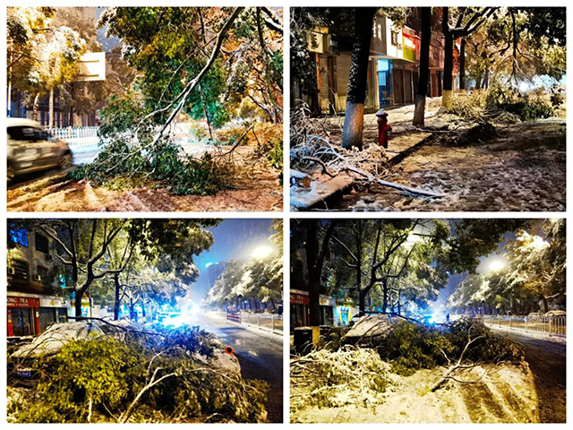 當(dāng)晚,漫天飛雪一直沒有停歇,勞動路、翠園路口積雪嚴(yán)重,路邊行道樹被積雪壓彎,部分樹枝墜落砸到車輛,影響行車安全。