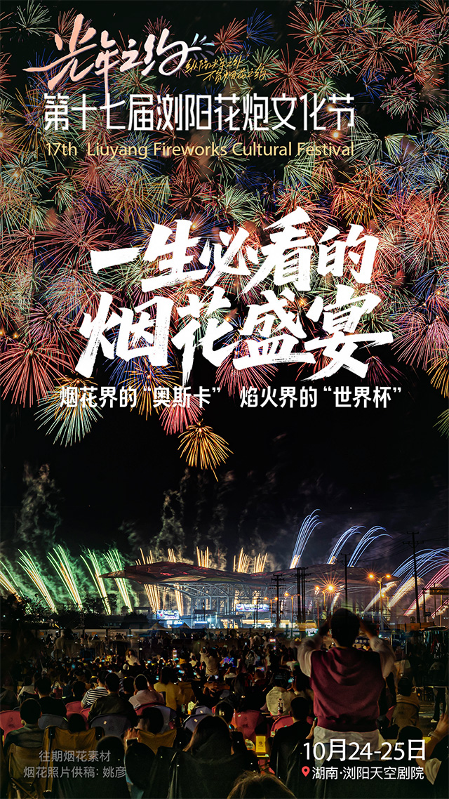 第十七屆瀏陽花炮文化節(jié)定檔10月24日-25日,將以“光年之約”為主題,突出國際范、科技感和文化味,創(chuàng)新推出六大主體活動,演繹寶藏級的千年文化,點(diǎn)亮百億級的富民產(chǎn)業(yè),綻放現(xiàn)象級的焰火經(jīng)濟(jì)。
