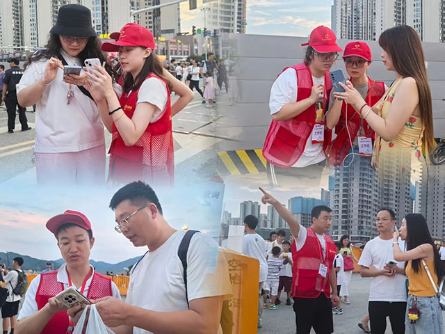 他們一邊耐心引導(dǎo)車輛有序駛?cè)牒鸵?guī)范停放,確保高峰時(shí)段車流不堵塞;一邊熱情解答游客關(guān)于停車位、入場(chǎng)路線的各類咨詢,化身游客身邊最可靠的“活體地圖”。他們?cè)谘婊甬?dāng)天下午四點(diǎn)前就要到崗,焰火結(jié)束才完成志愿服務(wù)。