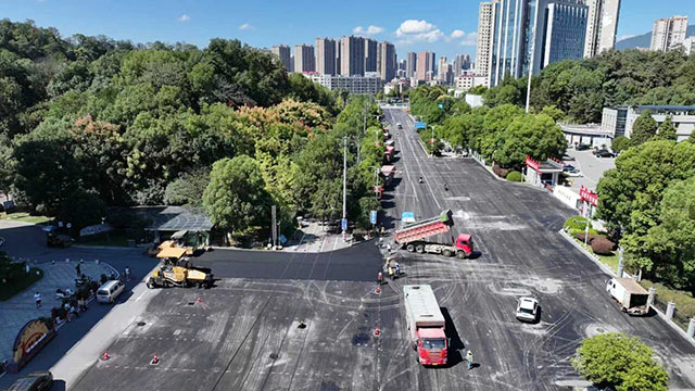 10月6日,中秋節(jié),在瀏陽大道-復(fù)興路段的施工現(xiàn)場,運輸車輛往來穿梭,井然有序;攤鋪機、壓路機等大型設(shè)備開足馬力,協(xié)同作業(yè)……40多名施工人員在各自崗位上忙碌,緊鑼密鼓地進行瀝青攤鋪作業(yè)。