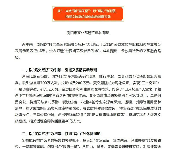 近日,湖南省文化和旅游廳向全省專題推介文旅融合發(fā)展典型經(jīng)驗,瀏陽憑借“以‘煙花’為引擎、拓展文旅融合新業(yè)態(tài)”的實踐成果,躋身全省僅有的兩個縣(市、區(qū))代表之列。這一省級認可,標志著瀏陽在打造全國文旅融合標桿的征程上邁出了關(guān)鍵一步。