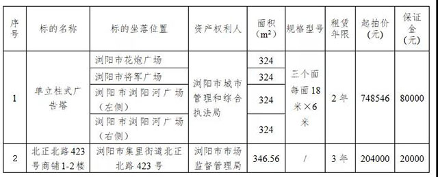受瀏陽市城市管理和綜合執(zhí)法局委托,根據(jù)國有資產(chǎn)管理的相關(guān)規(guī)定,我公司定于2021年7月30日上午10:00在瀏陽市城鄉(xiāng)發(fā)展集團(tuán)有限責(zé)任公司8樓會議室,對下列標(biāo)的面向社會進(jìn)行公開拍租,標(biāo)的情況見下表: