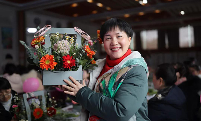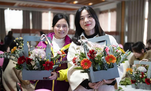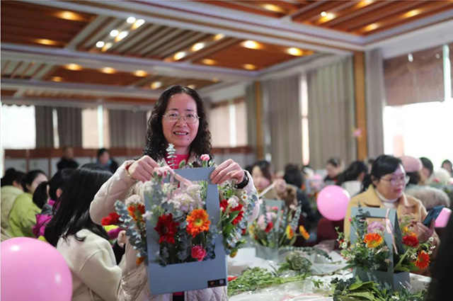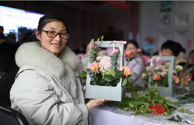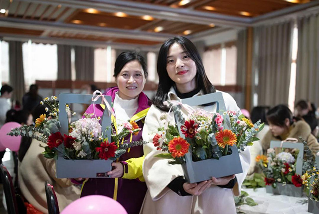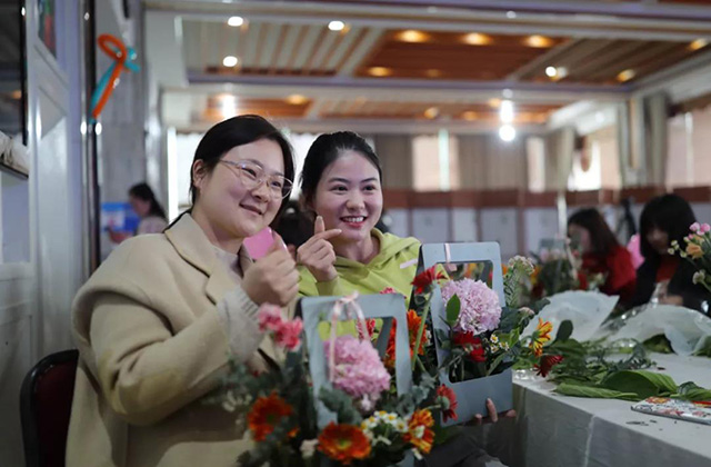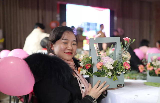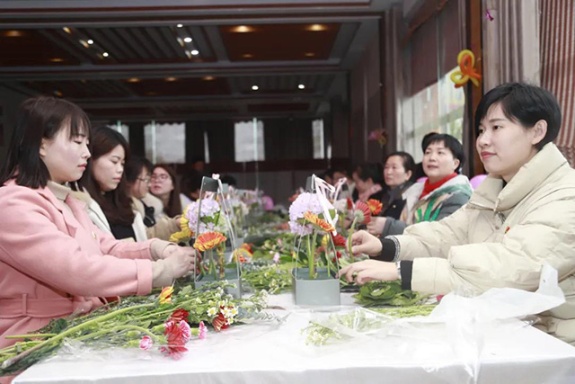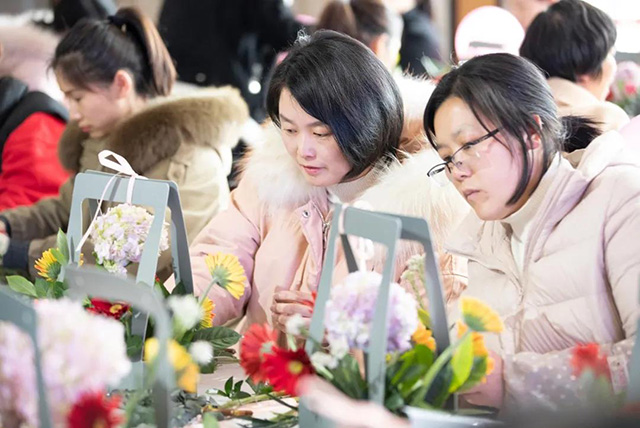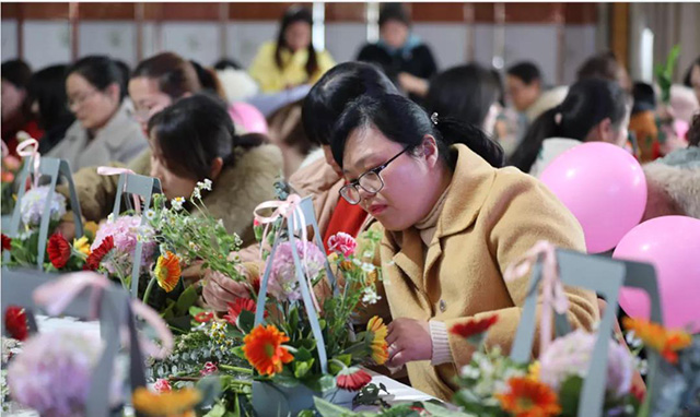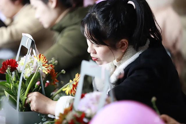 在專業(yè)花藝師的帶領下,女同胞們饒有興致地修枝剪葉,沉浸在花藝創(chuàng)作的浪漫氛圍中。