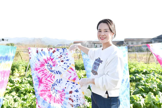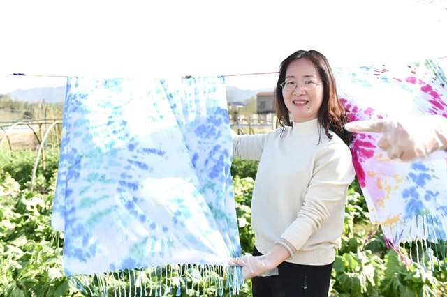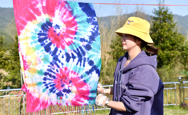 在現(xiàn)場(chǎng)老師的指導(dǎo)下,大家借助線繩、皮筋等工具,將圍巾折疊、纏繞、打結(jié)固定,然后在潔白素凈的圍巾上侵染上自己精心挑選的顏色。