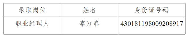瀏陽市健翔體育有限公司職業(yè)經(jīng)理人的面試、綜合考察、體檢等工作已經(jīng)結(jié)束,現(xiàn)將擬錄用人員名單公示如下: