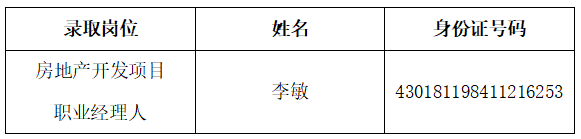 瀏陽市恒遠(yuǎn)建設(shè)開發(fā)有限公司公開招聘房地產(chǎn)開發(fā)項(xiàng)目職業(yè)經(jīng)理人資格審查、筆試、面試、體檢、綜合考察工作均已經(jīng)結(jié)束,現(xiàn)將擬錄用人員名單公示如下: